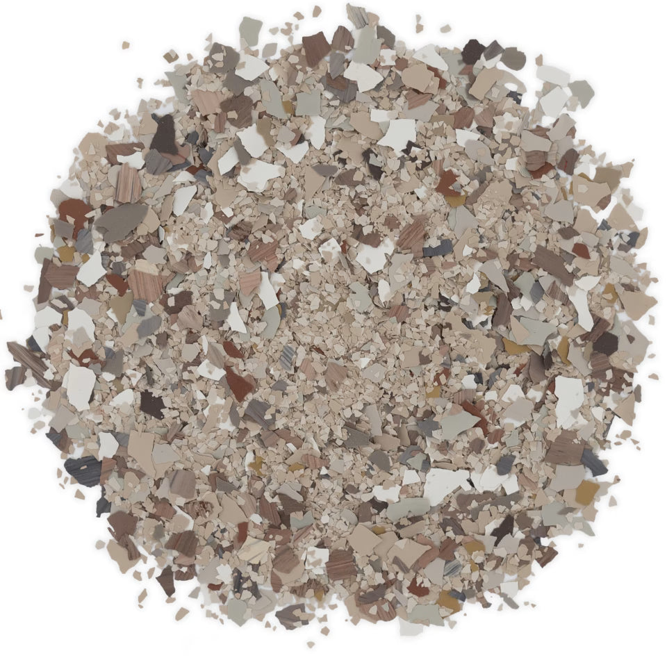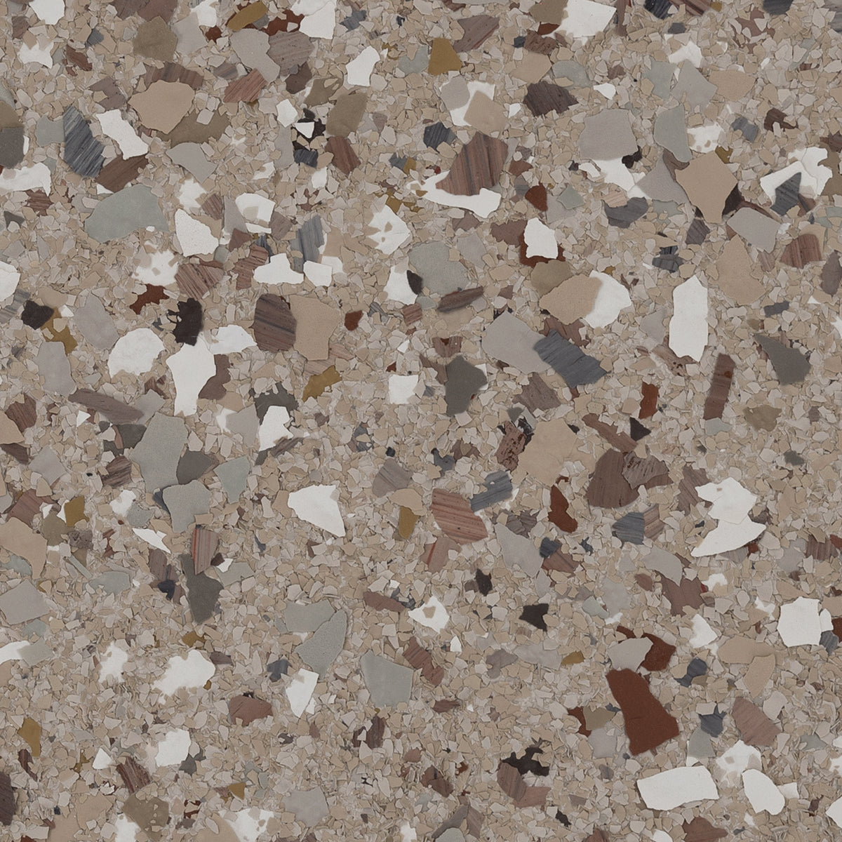 Phoenix offers a light and neutral flooring option with a carefully balanced design. Its brown base is complemented by subtle accents of grey, white, red, and yellow, creating a harmonious and sophisticated look. This Terrazzo blend highlights the artistry of combining multiple flake sizes, producing an aggregate-like appearance that adds depth and character reminiscent of traditional Terrazzo flooring. Ideal for creating a serene environment, Phoenix brings warmth and tranquility to any space.