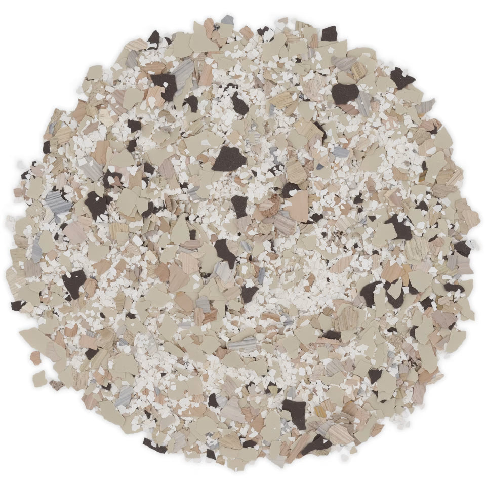 Plateau is carefully designed to deliver a balanced mix of flake sizes and colours. Plateau combine multiple flake sizes to achieve an aggregate-like appearance reminiscent of traditional terrazzo flooring. This striking blend features harmonious tones of brown, grey, and white, creating a subtle, light, and neutral flooring option that enhances a variety of design styles. With its thoughtful combination of colours and textures, Plateau brings natural beauty and refined elegance to any space.