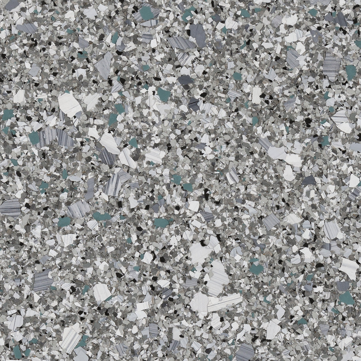 Turquoise provides a neutral and captivating flooring option inspired by the natural beauty of turquoise gemstones. This blend combines black, grey, white, and blue accents to replicate the timeless appeal of polished stone surfaces. Like all blends in the Stone collection, Turquoise features hybrid-sized flakes that create an aggregate-like appearance, reflecting the depth and sophistication of authentic stone. Perfect for enhancing any space, Turquoise brings versatile elegance and a sense of calm with its tranquil hues.